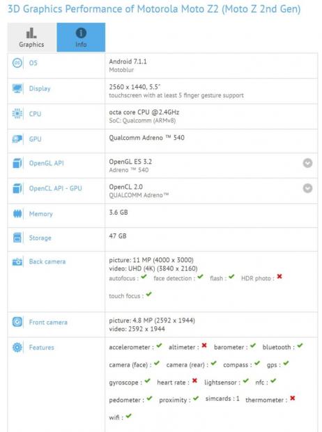 Theo androidheadlines, Moto Z2 đang được thử nghiệm trên GFXBench, máy có màn hình 5.5 inch độ phân giải 2K. Smartphone này cũng chạy trên nền tảng Android 7.1.1 Nougat, rất có thể đây là Android gốc hoặc chỉnh sửa rất ít.