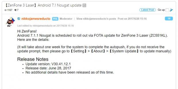 Asus ZenFone 3 Laser (ZC551KL) được bán ra tháng 8/2016, và chạy Android 6.0.1 Marshmallow. Sau đó một thời gian, máy cập nhật lên 7.0 Nougat, và bây giờ lại được Asus cập nhật phiên bản Android 7.1.1 mới nhất. Bản cập nhật Android 7.1.1 cho ZenFone 3 Laser lần này là phiên bản V30.41.12.1, tung ra ngày 28/6/2017. Ngoài ra không có chi tiết nào được nói đến bản cập nhật này.