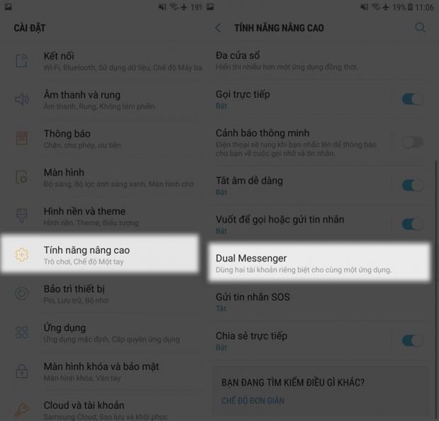Đầu tiên, các bạn vào Cài đặt > Tính năng nâng cao > Dual Messenger (Đây là tính năng nâng cao cho phép bạn sử dụng 2 tài khoản trên cùng một ứng dụng).