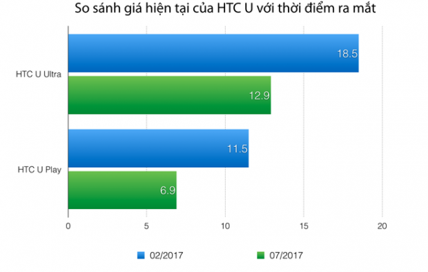 Do sức tiêu thụ kém, HTC đã liên tục phải điều chỉnh giá hai chiếc máy này. HTC U Ultra đã giảm giá hai lần, từ 18,49 triệu xuống 15,49 triệu hồi cuối tháng Ba, và 15,49 triệu xuống 14,99 triệu hồi cuối tháng Tư. Tổng cộng, máy giảm 3,5 triệu đồng trong hơn 2 tháng. Cùng lúc đó, HTC U Play cũng giảm giá xuống mức 8,99 triệu, mất giá 2,6 triệu đồng.
