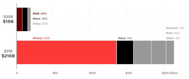 Năm tài chính 2006, Apple thu được 1,9 tỉ USD lợi nhuận và 19,3 tỉ USD doanh thu, chủ yếu là từ iPod và Mac. Còn trong năm 2016, Apple đã kiếm được 45,6 tỉ USD tiền lời trên doanh thu 215,6 tỉ USD. 63% doanh số năm ngoái đến từ iPhone, và phần lợi nhuận do iPhone đóng góp có lẽ còn cao hơn.