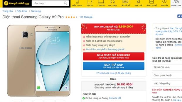 Cụ thể hơn, Galaxy A9 Pro, A5 2016, A7 2016 đang được áp dụng chương trình mua online giá rẻ, khởi chạy đến hết ngày 31/7/2017, với giá giảm như sau:
