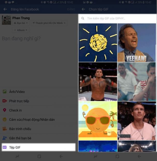 Đầu tiên, các bạn vào phần đăng status và kéo xuống cuối, bạn sẽ thấy mục ảnh GIF, bấm vào đó để thử.