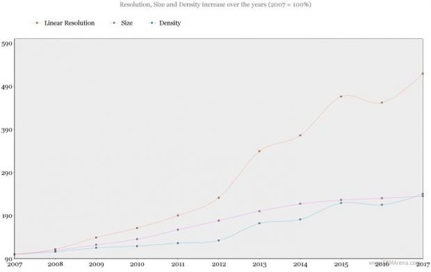 Cuối cùng, dưới đây là một sơ đồ tóm gọn quá trình hình thành độ phân giải đã được cải thiện nhanh chóng trong một thập kỷ qua. Với năm 2017 được xem như là cột mốc chuẩn và so sánh phần trăm độ phân giải, mật độ điểm ảnh và kích thước màn hình đã gia tăng như thế nào.