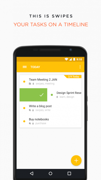 Swipes giúp tự động thu thập tất cả các công việc bạn cần để thực hiện, sắp xếp theo ưu tiên cá nhân của bạn. Giống như cái tên Swipes là cử chỉ dùng để thực hiện các chức năng như vuốt sang phải để hoàn thành công việc hay vuốt sang trái để đặt lại lịch. Nếu bạn có sử dụng ứng dụng email Inbox của Google thì sẽ thấy cách thực hiện của chúng là khá giống nhau.