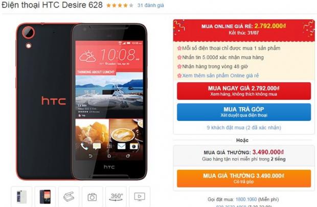 Đây có thể là lần giảm giá cuối cùng của Desire 628, sản phẩm này hiện đang được hạ giá từ 3.49 triệu xuống chỉ còn 2.79 triệu đồng, giảm tới 700 ngàn đồng. Lưu ý chương trình mua online giảm giá này sẽ kết thúc vào ngày 31/7 nhé.