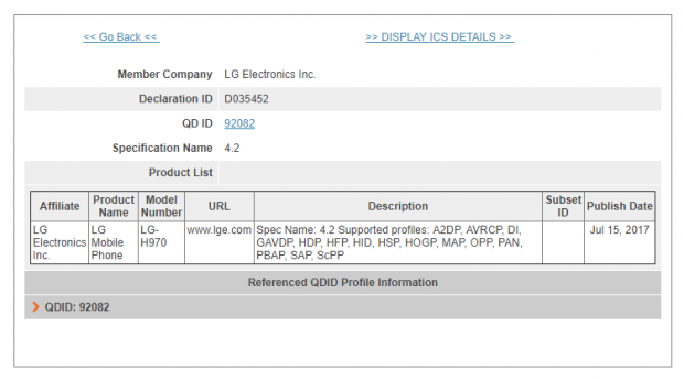 Cụ thể theo chứng nhận từ Bluetooth SIG thì LG V30 chỉ hỗ trợ Bluetooth 4.2 thay vì chuẩn 5.0 như trên các flagship hàng đầu hiện nay.