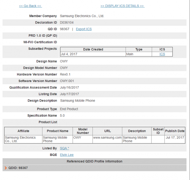 Tuy nhiên gần đây, một thiết bị cao cấp của ASUS cũng đã đạt chứng nhận Bluetooth 5.0, và bây giờ đến lượt một smartphone của Samsung với tên gọi OWY sở hữu chứng nhận này, rất có khả năng đây là một thiết bị cao cấp của Samsung sắp được giới thiệu.