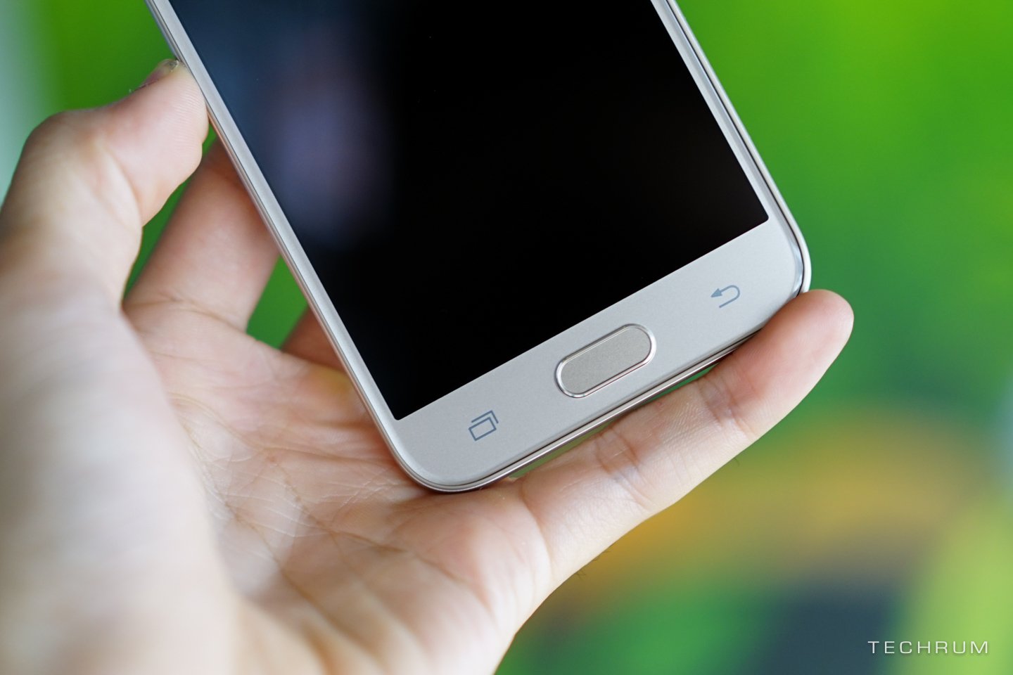 Galaxy J3 Pro sở hữu ngoại hình vừa bầu bĩnh dễ thương vừa chất liệu kim loại sang trọng. Mặt sau chính là điểm nhấn thiết kế của J3 Pro với mặt lưng kim loại nhưng phần viền bao quanh máy lại chỉ được làm bằng nhựa và được cắt vát khá độc đáo. Trong khi đó, mặt trước J3 Pro lại chả khác gì các sản phẩm tầm trung gần đây của Samsung, vẫn là logo hãng nằm ngay phía trên màn hình khá rối mắt còn phía dưới là nút home vật lý truyền thống của Samsung, nhưng phím home trên Galaxy J3 Pro không được tích hợp cảm biến vân tay.