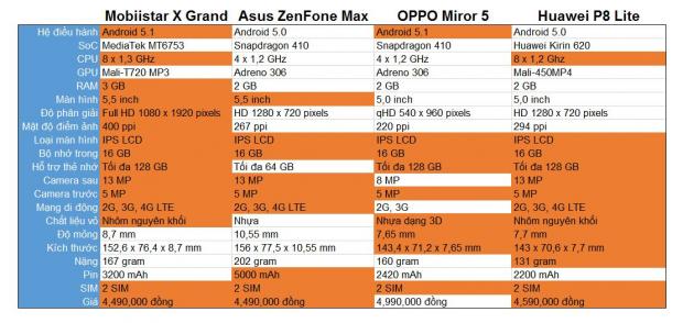Phân khúc smartphone dưới 5 triệu đang là phân khúc được người dùng quan tâm nhất vì đây là mức giá phù hợp với túi tiền của số đông người mua điện thoại. Do đó ở phân khúc này đang là một sự cạnh tranh khốc liệt của rất nhiều thương hiệu. Hôm nay chúng tôi sẽ giới thiệu cho các bạn 4 chiếc smartphone đáng chú ý nhất dưới 5 triệu đồng trong thời điểm này, đó là Mobiistar X Grand, Asus ZenFone Max, OPPO Mirror 5 và Huawei P8 Lite. Trong đó OPPO Mirror 5 và Huawei P8 Lite tập trung về thiết kế, ZenFone Max có thời lượng pin khủng còn chiếc điện thoại thương hiệu Việt Mobiistar tỏ ra nổi bật hơn cả nhờ những thông số cao cấp như 3GB RAM cùng màn hình Full HD. Mời các bạn theo dõi chi tiết ở bảng so sánh cấu hình dưới đây: