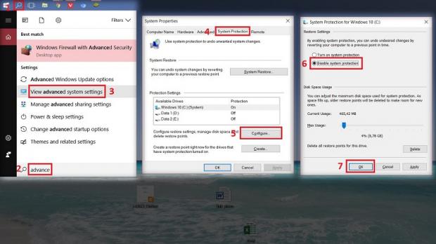 Nếu bạn không muốn sử dụng chức năng System Restore thì nên tắt đi, để giải phóng bộ nhớ, dung lượng lưu trữ cũng như hạn chế các dịch vụ chạy ngầm của Windows 10. Để tắt System Restore trên Windows 10, vào thanh công cụ tìm kiếm từ khóa Advanced system settings, sau đó chọn tab System Protection, ở chế độ mặc định thì chế độ này đã được kích hoạt (Protection = On). Nhấn nút Configure, cửa sổ tiếp theo hiện ra các bạn chọn Disable system protection để tắt chức năng System Restore nhé, rồi nhấn OK là xong.