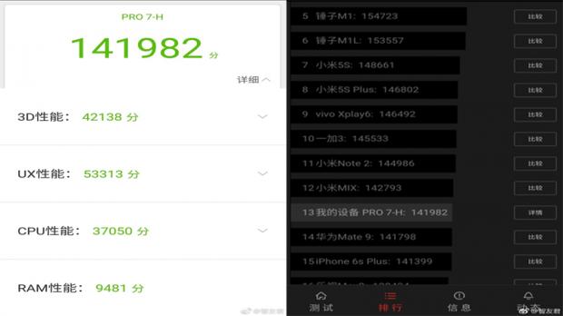 Rất nhanh chóng, kết quả đo hiệu suất của thiết bị đã xuất hiện qua một tài khoản trên Weibo với số điểm 141982, đứng vị trí ngay sau Snapdragon 821 của Mi Note 2 và Kirin 960 của Huawei Mate 9.