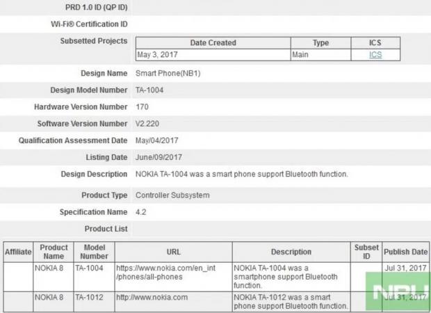 Có lẽ điều gây “bối rối' cho người dùng chính là tên của thiết bị, có lúc là Nokia 8, có lúc là Nokia 9. Nhưng theo chứng chỉ Bluetooth mới nhất thì máy sẽ có tên chính thức là Nokia 8. Trong hai model TA-1004 và TA-1012 thì TA-1012 là máy từng xuất hiện trên các trang benchmark với cả 4GB và 6GB, nhiều khả năng đây chính là bản đặc biệt như Arte Black hoặc là bản Vàng Đồng từng xuất hiện cách đây ít lâu.