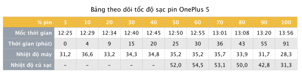 Cấu hình cao, màn hình đẹp, camera ngon, nếu pin mà cũng ngon nữa thì tuyệt vời. Mình xác nhận pin của OnePlus 5 rất tốt. Chẳng những có thời lượng onscreen dài (6-8 tiếng) mà tốc độ sạc pin cũng rất nhanh. Cụ thể: