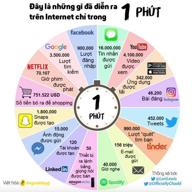 60 giây là khoảng thời gian ngắn. Nhưng chỉ cần từng đó thời gian, trên mạng Internet cùng lúc đã diễn ra rất nhiều điều thú vị. Vậy trong 1 phút, chuyện gì đã diễn ra trên mạng? Tất cả sẽ được giải đáp ngay sau đây.Bấm vào ảnh để xem lớn. Hoặc bạn có thể xem chi tiết ở bên dưới đây!