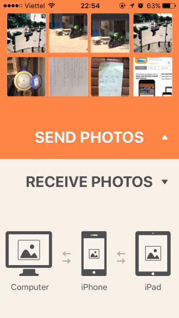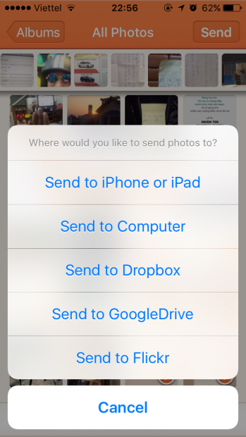 Bước 2: Chọn Send Photos hoặc Receive Photos, ở đây mình chọn Send Photos để gửi hình