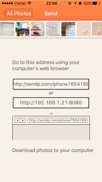 Bước 4: Xuất hiện danh sách để chuyển, ta chọn Send to Computer. Ngoài ra, còn có các tùy chọn chuyển tới iPhone, iPad hay các dịch vu lưu trữ đám mây như Dropbox, GoogleDrive, Flickr. Sau đó ứng dụng sẽ cung cấp đường dẫn địa chỉ.