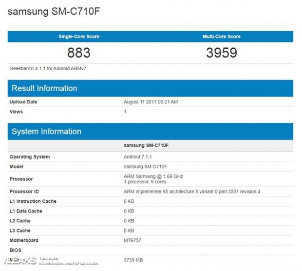 Cũng trên Geekbench, Galaxy C7 2017 đạt điểm hiệu năng đơn lõi là 883 điểm, đa lõi là 3959 điểm, điểm số dành cho những smartphone tầm trung. Rất có thể Galaxy C7 2017 sẽ được Samsung ra mắt tại triển lãm IFA 2017 sắp diễn ra vào tháng 9 tới.