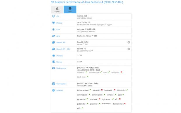 GFXBench cũng cho biết, ZenFone 4 sẽ chỉ được trang bị một camera 12MP ở mặt sau và một 8MP ở mặt trước, trong khi đó các tin đồn trước đây lại cho rằng, thiết bị sẽ sở hữu một cụm camera kép (12MP + 8MP). Hệ điều hành Android 7.1.1 Nougat sẽ được cài sẵn trên thiết bị.