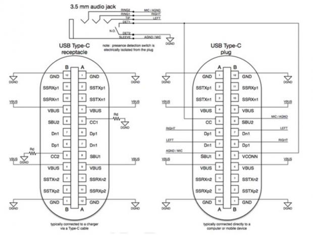 Bởi theo công bố của Tổ chức Thiết lập Tiêu chuẩn USB (USB-IF): Cổng USB Type-C cho phép xuất âm thanh dạng tương tự qua 2 chân Dp và Dn, đồng thời hỗ trợ thu âm thanh từ micro qua chân SBU1 và SBU2 (bạn có thể xem ở sơ đồ minh hoạ phía trên).