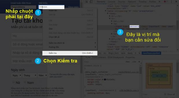 Khi người dùng truy cập và một trang web có hiển thị sẵn tài khoản cũng như mật khẩu, ví dụ như Facebook, các bạn chỉ cần nhấp chuột phải tại khung Mật khẩu và chọn Kiểm tra. Ngay lập tức, một bảng với các dòng code tương ứng hiện lên ngay bên phải của trình duyệt.