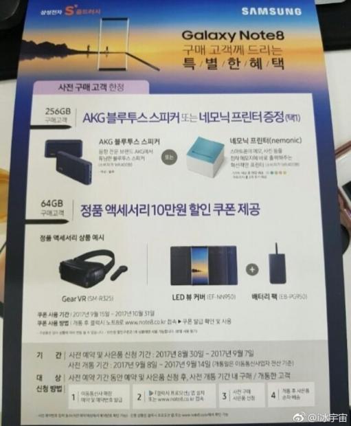 Theo androidheadlines, mới đây một tờ rơi quảng cáo về Galaxy Note 8 đã xuất hiện tại Hàn Quốc, nó được mô tả cùng với bút S Pen cùng nhiều tính năng khác. Đặc biệt hơn, ngay ở phần giới thiệu đầu tiên chúng ta sẽ thấy ngay Note 8 có bản 256 GB. Ngoài ra, Galaxy Note 8 còn đi kèm với một bộ tai nghe AKG.