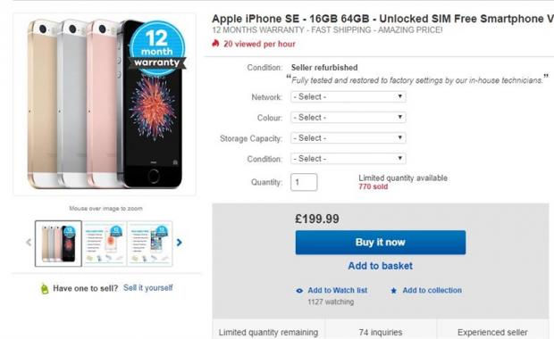 Theo gsmarena, iPhone SE tân trang hiện đang được bán trên eBay với giá chỉ từ 200 Euro (cho phiên bản 16 GB), nếu bạn chọn bản 64 GB thì giá bán sẽ là 240 Euro. Được biết, các phiên bản này vẫn đầy đủ bảo hành chính hãng trong 12 tháng.