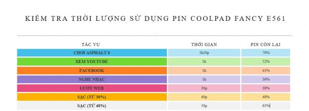 Với việc trang bị viên pin không cao chỉ 1800mAh cho Coolpad Fancy E561 làm mình khá lo lắng về các bài kiểm tra tuy nhiên thực tế cho thấy các con số mà sản phẩm đạt được rất ấn tượng. 5 tiếng sử dụng liên tục mà vẫn còn khoảng 30% pin tức là nếu sử dụng tiếp tục thì mình có thể đạt được khoảng 7h hoặc hơn để trải nghiệm máy. Đây là một mức thời gian mà không phải nhiều smartphone hiện nay làm được nhất là trong tầm giá hoặc pin dưới 3000mAh. Chính vì thế bạn có thể hoàn toàn yên tâm về thời lượng sử dụng pin nếu bạn còn đang phân vân sau khi xem các thông số mà nhà sản xuất đưa ra.