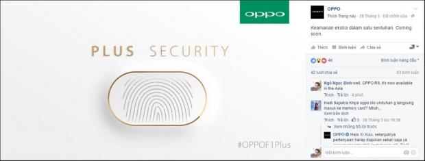 Như đã biết thì F1 Plus sẽ được ra mắt vào khoảng tháng 4 tới và có thiết kế gần như giống hệ với phiên bản tiềm nhiệm chỉ lớn hơn ở kích thước màn hình là 5.5 inch Full HD. Tuy nhiên, một teaser (quảng cáo) mới chính thức gợi ý rằng F1 Plus sẽ có thêm một máy quét vân tay. Bức hình mà các bạn thấy được chia sẻ bởi chính OPPO Indo và với một thông điệp 'Keamanan ekstra dalam satu sentuhan. Coming soon - Bảo mật hơn với cảm biến vân tay một chạm. Sẽ đến sớm'.