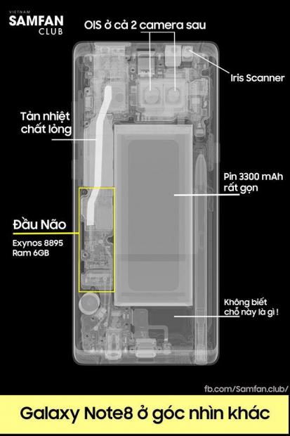 Như các bạn đã thấy ảnh trên, ngoại trừ phần linh kiện bên dưới góc phải của Galaxy Note 8 mà SamFan Club không biết là gì, thì các phần còn lại đều hiển thị rõ nét từ trên xuống, bao gồm: Tích hợp chống rung OIS ở cả hai camera, máy quét mống mắt, tản nhiệt bằng chất lỏng, pin 3.300 mAh được thiết kế rất gọn và 'đầu não' chip Exynos 8895 + RAM 6GB.