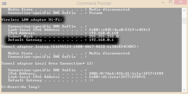 Đầu tiên bạn cần truy cập command prompt từ thiết bị Windows. Sau đó nhập lệnh ipconfig và enter. Sau đó, bạn sao chép đoạn địa chỉ IP tại mục Default gateway ở Wireless LAN adapter Wi-Fi.