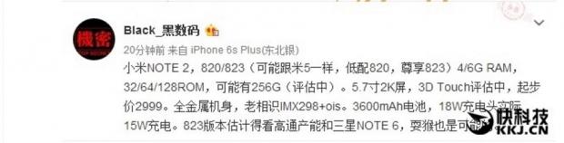 Các cải tiến khác bao gồm vi xử lý mà Mi Note 2 sử dụng có thể sẽ là Snapdragon 823 bản nâng cấp của Snapdragon 820 (hoặc chip 820 nhưng nâng xung lên). Dung lượng RAM được tăng lên mức 4GB/6GB và bộ nhớ trong là 32/64/128/256GB. Xiaomi sẽ sử dụng cảm biến ảnh Sony IMX298 16MP cùng công nghệ chống rung OIS cho camera chính. Dung lượng pin của Mi Note 2 là 3.600 mAh hỗ trợ sạc nhanh Quick Charge 3.0.