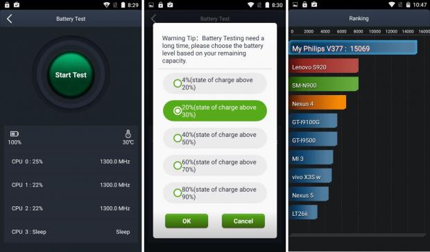 Để kiểm tra pin của Philips V377, người viết sử dụng công cụ Battery Test của ứng dụng Antutu Tester, hiện đang được rất nhiều tín đồ công nghệ tin tưởng. Bước đầu tiên là sạc đầy pin cho máy lên mức 100%, sau đó, mở Battery Test và chọn chế độ kiểm tra 20% (nghĩa là kiểm tra đến lúc mức dung lượng pin giảm 20%). Ứng dụng sẽ tiến hành chạy các tác vụ bao gồm duyệt web và các nội dung media. Quá trình thử nghiệm được tiến hành ở độ sáng màn hình 100%, kết nối WIFI và bật toàn bộ tính năng thông báo của các ứng dụng.