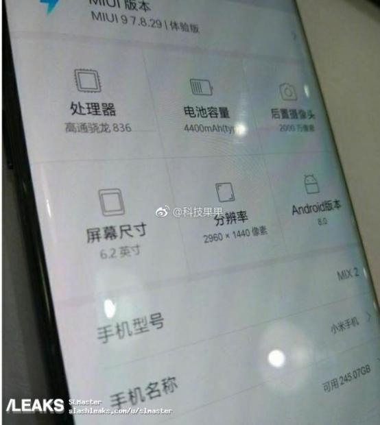 Theo hình ảnh rò rỉ trên, Xiaomi Mi MIX 2 sẽ sở hữu màn hình kích thước 6.2 inch độ phân giải 2960x1440 pixels. Cung cấp sức mạnh cho thiết bị sẽ là vi xử lý Snapdragon 836 mới nhất đến từ Qualcomm, bộ nhớ trong 256 GB và hệ điều hành Android 8 Oreo cùng giao diện MIUI 9.