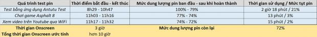 Để kiểm nghiệm chính xác hơn, người viết còn tiến hành một thử nghiệm khác, đó là chơi thử Asphalt 8, một game đua xe nổi tiếng và khá “nặng nề” trên nền tảng Android, với mức độ sử dụng hiệu năng phần cứng cao và có nhiều chuyển động đồ họa liên tục. Kết quả thu được rất ấn tượng, khi sau 13 phút chơi game liên tục, mức dung lượng pin chỉ giảm 3%, từ 77% xuống 74%. Tiếp theo, thử nghiệm bật xem một video 360p trên ứng dụng Youtube qua kết nối WIFi cho kết quả dung lượng pin chỉ giảm 2%, từ 74% xuống 72% trong suốt 15 phút.