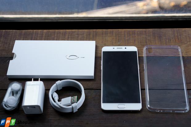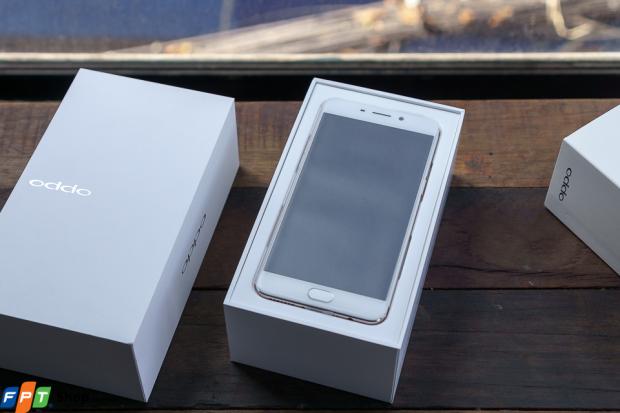 Năm nay, F1 Plus được OPPO đóng gói rất đẹp mắt, tổng thể là một chiếc hộp nhựa màu trắng, phía trước có in hình của máy cùng dòng chữ 'selfie expert' (chuyên gia selfie), trong khi mặt sau bao gồm thông số kỹ thuật của sản phẩm.