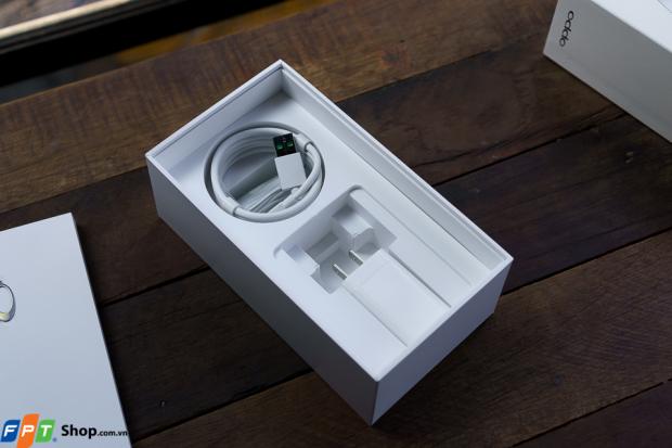 Các phụ kiện bên trong F1 Plus được sắp xếp rất ngăn nắp, bao gồm máy, củ sạc nhanh VOOC, tai nghe, cáp kết nối, sách hướng dẫn sử dụng, que chọc SIM và 1 ốp lưng bảo vệ bằng nhựa dẻo.