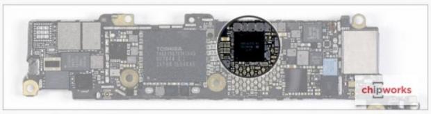 Đầu tiên chip A9 được sử dụng trong chiếc iPhone SE giống hệt loại chip được sử dụng trong chiếc iPhone 6s. Vi xử lý của chiếc điện thoại SE trong tay của ChipWorks đến từ nhà sản xuất TSMC , mặc dù con chip này có thể khác nhau tùy theo từng sản phẩm. Hơn nữa, thiết bị này cũng đang sử dụng RAM 2GB LPDDR4, chính là loại RAM mà iPhone 6s đang sử dụng. Ngày sản xuất in trên linh kiện này là khoảng tháng 8 hoặc tháng 9 năm ngoái. Điều này có nghĩa là linh kiện này đã nằm trong kho suốt từ bấy và vốn định sử dụng cho chiếc iPhone 6s. Một điểm nữa về bộ nhớ đó là sản phẩm này sở hữu loại chip 16GB flash do Toshiba sản xuất và đây là một con chip mới.