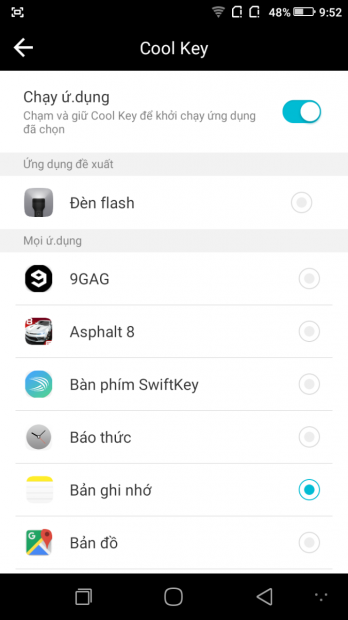 Dưới cùng có tính năng Chạy ứng dụng, khi chọn bật tính năng này lên thì sẽ có toàn bộ các ứng dụng đã cài đặt trong máy, bạn chọn ứng dụng muốn khởi động nhanh.