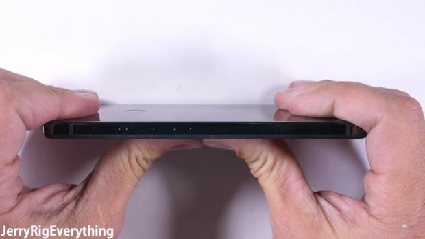 Cuối cùng là thử nghiệm bẻ cong, có thể thấy khung viền titamium đã mang lại độ bền rất cao cho thiết bị này và khiến cho JerryRigEverything không thể làm hư hại máy khi bẻ từ mọi phía.