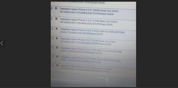 Trong lần rò rĩ lần này, một hình ảnh được cho là được chụp từ màn hình của nhà cung cấp cơ sở dữ liệu danh sách các chiếc iPhone sắp được ra mắt đã bị phát tán. Và theo như hình ảnh, chiếc iPhone X sắp ra mắt sẽ sở hữu thiết kế màn hình không viền có kích thước 5.8 inch (1125 x 2436 pixel) tích hợp cùng tấm nền AMOLED, chạy vi xử lý A11 cho tốc độ 2.5GHz, 3GB RAM, cụm camera kép ở mặt sau có độ phân giải 12MP. Và thông tin cuối cùng trong lần rò rỉ lần này chính là giá bán và các phiên bản bộ nhớ trong của nó: Với 64GB bộ nhớ trong, iPhone X sẽ có giá là 999USD, và sẽ là 1199USD với phiên bản 512GB.