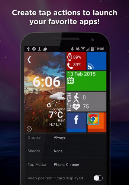 Là một mặt đồng hồ đẹp với phong cách hiện đại cho thiết bi Android Wear với khả năng tuỳ biến linh hoạt, cung cấp cho bạn một số tuỳ chọn hữu ích như thời tiết, nhiệt độ, % pin của smartphone cùng với smartwatch. Người dùng có thể tuỳ chỉnh theo phong cách đơn giản hoặc chi tiết theo sở thích.