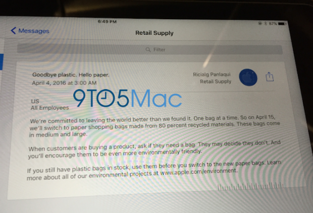 Và bây giờ, có vẻ như trung tâm đầu não Cupertino đang bắt đầu thực hiện kế hoạch hướng tới một môi trường kinh doanh thân thiện hơn. Một bản ghi nhớ nội bộ đã bị rò rỉ cho thấy rằng bắt đầu từ 15/4, các cửa hàng của Apple sẽ ngừng sử dụng túi nhựa nilon đã từng là biểu tượng của hãng và sẽ dần chuyển sang các túi giấy cấu thành từ hơn 80% vật liệu tái chế.
