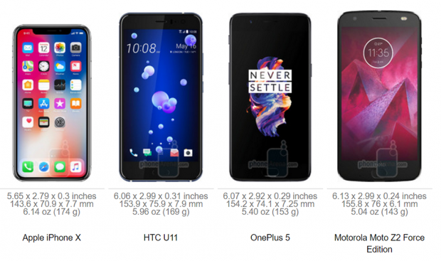 Ba đối thủ cuối cùng của iPhone X trong bài viết hôm nay là HTC U11, OnePlus 5 và Motorola Moto Z2 Force Edition. Có thể thấy iPhone X nhỏ gọn hơn đáng kể dù sở hữu kích thước lớn nhất trong 4 máy.