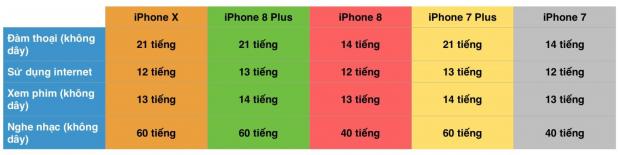 Tuy nhiên Apple cũng đã cung cấp các thông tin về thời gian sử dụng thực tế cho iPhone 8, iPhone 8 Plus và iPhone X. Theo kết quả này thì không có nhiều sự khác biệt về thời gian sử dụng giữa các mẫu màn hình lớn là iPhone X, iPhone 8 Plus và iPhone 7 Plus. Trong khi đó thì iPhone 8 và iPhone 7 có thời lượng pin ít hơn. Đây là điều dễ hiểu khi Apple vẫn giữ thiết kế rất mỏng và bộ khung quen thuộc nên không thể trang bị một viên pin dung lượng cao hơn. Mặc dù vậy thời lượng pin iPhone 7 Plus đã rất tốt nên những người dùng iPhone X hay iPhone 8 Plus hoàn toàn có thể yên tâm.