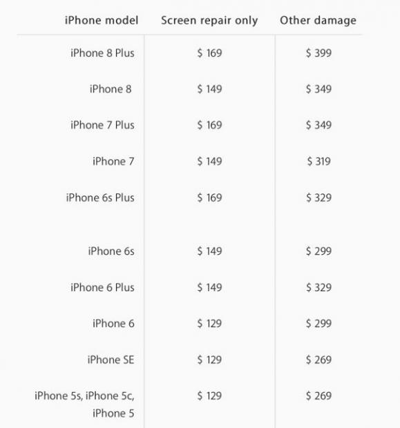 Apple thay đổi bảng giá sửa chữa và thay thế linh kiện các mẫu iPhoneCụ thể, giá sửa chữa màn hình của iPhone 6 và SE có mức tăng 30 USD so với sửa chữa màn hình 99 USD trước đây. iPhone 6 và 7 có mức tăng 20 USD so với chi phí 129 USD trước đó, cũng như tất cả các điện thoại iPhones Plus đều có mức tăng 20 USD lên tới 169 USD.