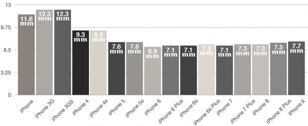 iPhone 7 và iPhone 7 Plus vẫn đạt độ dày tương ứng như iPhone 6 và 6 Plus tuy nhiên với iPhone 8, 8 Plus và iPhone X độ dày đã được nâng lên.