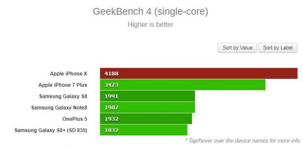 Chip A11 Bionic đã tăng điểm hiệu năng đơn lõi gần gấp đôi so với chip A10 Fusion trước đó, và nó vượt xa điểm hiệu năng đơn lõi của chip Snapdragon 835, Exynos 8895.