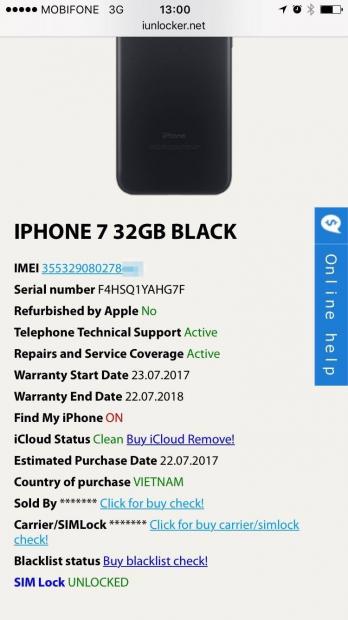Mọi thông tin từ chiếc máy đó sẽ được hiện ra rõ mồn một trước mắt bạn như: Ngày kích hoạt bảo hành, ngày hết hạn bảo hành, có bị iCloud ẩn hay không, nơi bán và đặc biệt là máy Lock hay Quốc tế (SIM Unlock là máy quốc tế, còn lại là Lock).