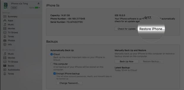 Sau đó bạn sẽ được đưa đến tùy chỉnh sao lưu và restore iPhone, tại đây nhấn vào Khôi phục iPhone (Restore iPhone) ở tùy chọn phía trên. Sau khi quá trình khôi phục hoàn tất, iPhone sẽ được đưa về trạng thái ban đầu lúc xuất xưởng.